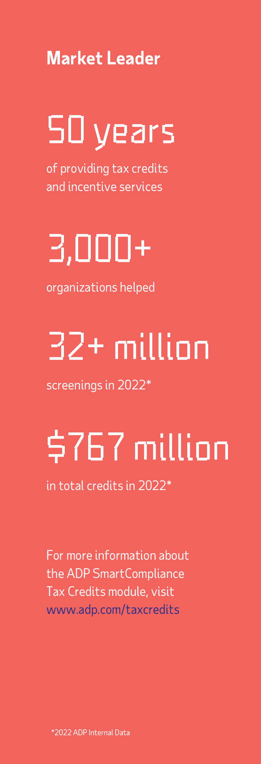 Identify, capture and maximize tax credits for your organization with the ADP Tax Credits Integration to screen job applicants that may qualify for your company for the Work Opportunity Tax Credit (WOTC).