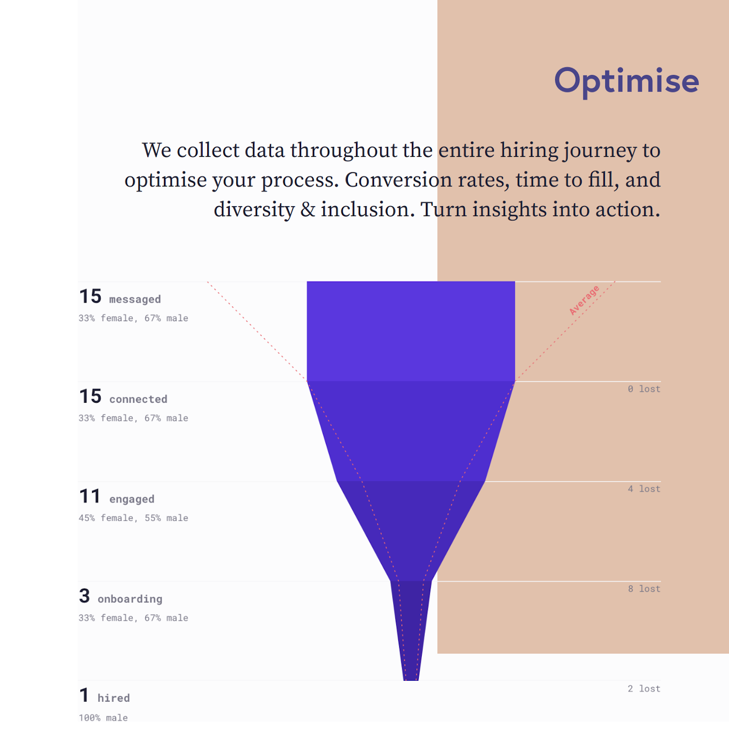Support DE&I throughout your hiring workflow with our holistic top-of-funnel data insights that track and analyse conversion metrics.