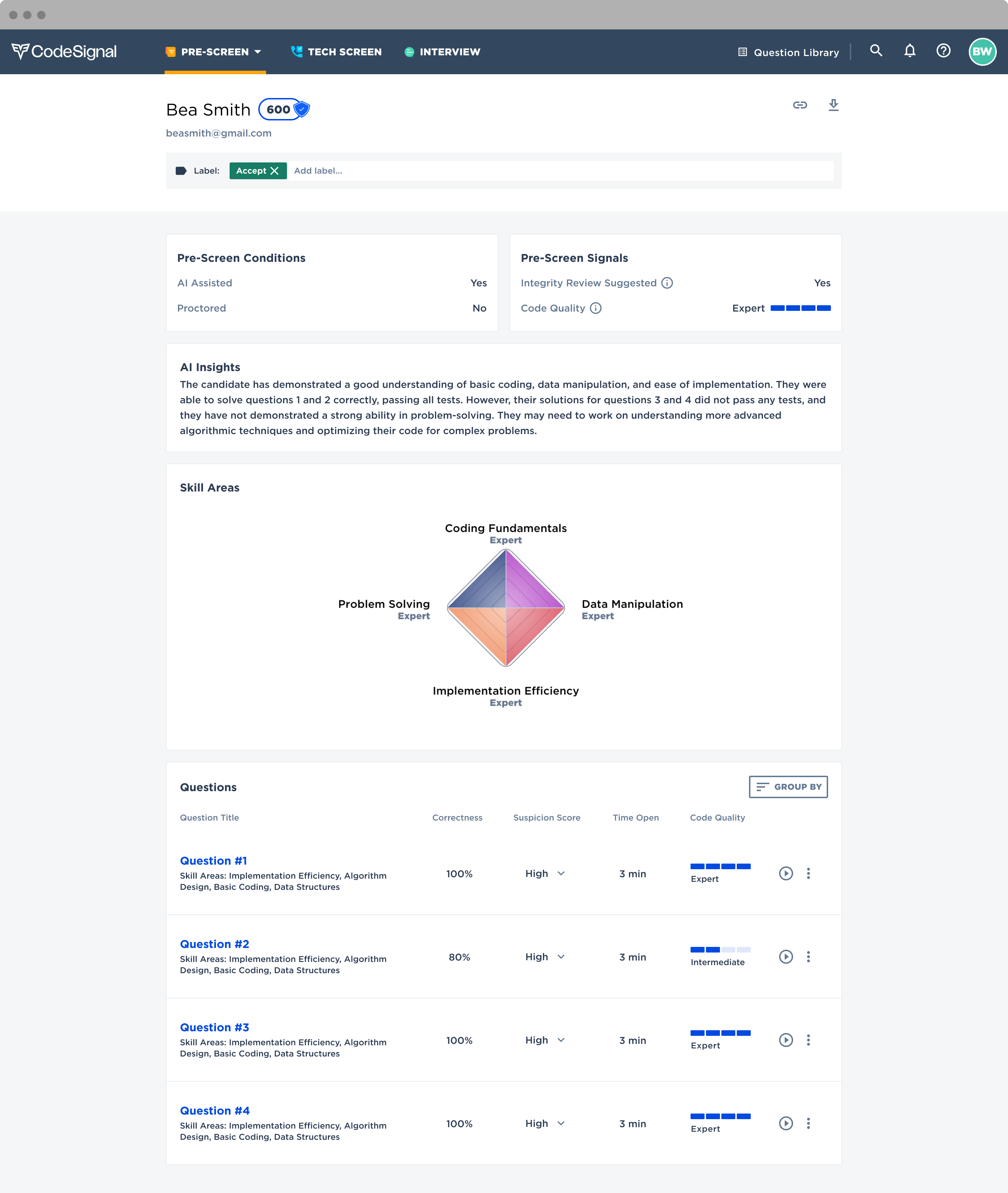 CodeSignal Pre-Screen is a top-of-the-funnel IDE-based assessment that is purpose-built to identify quality candidates in high-volume recruiting scenarios, such as university recruiting. Recruiters can instantly send pre-screen assessments to their entire candidate pipeline and start evaluating applicants based on their skills, not just their resumes.