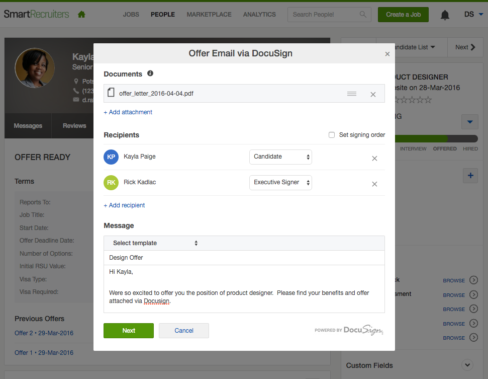 Use Docusign to send offer packets for e-signatures directly from SmartRecruiters