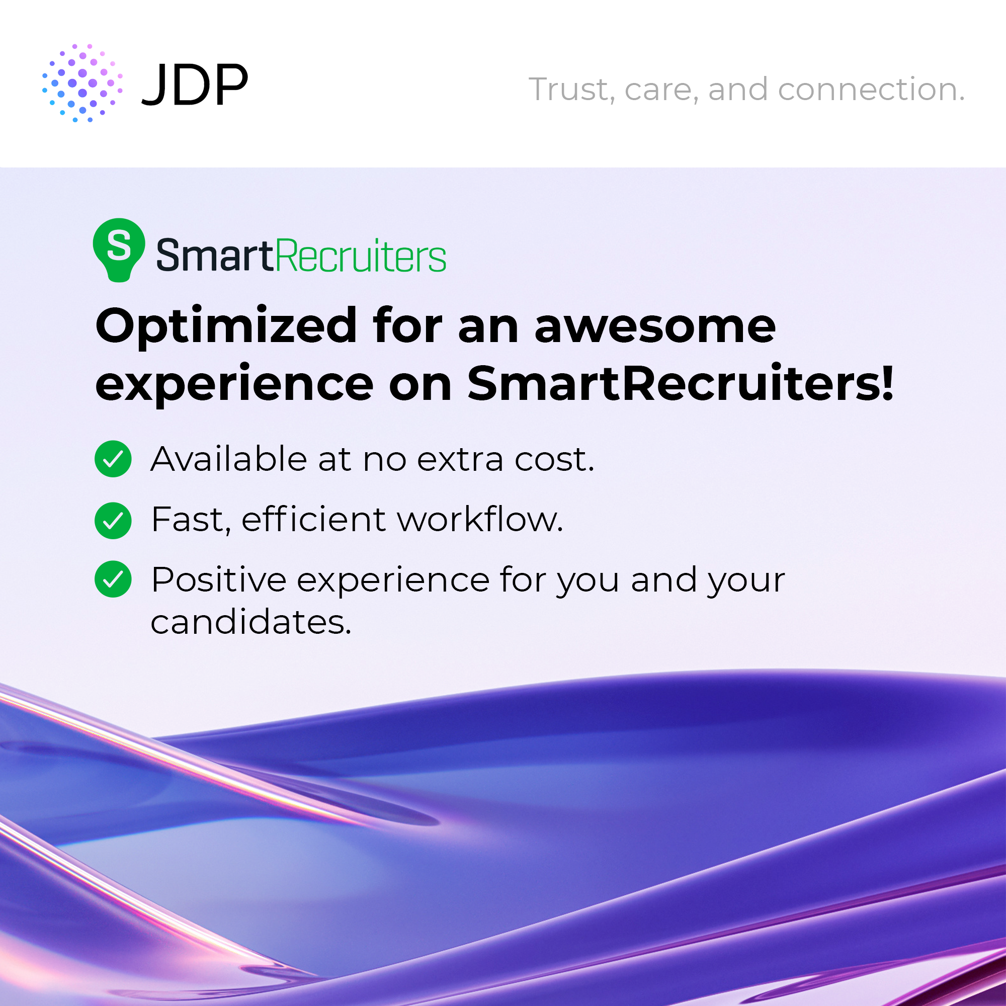 More trust, care, and connection at no extra cost with JDP's SmartRecruiters integration.