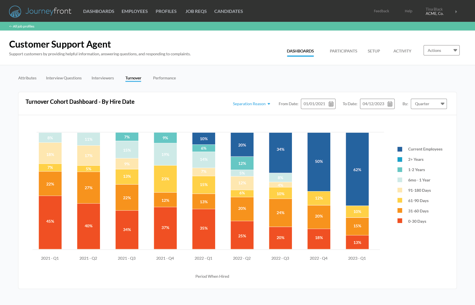 Journeyfront’s suite of data-driven hiring tools and turnover/performance analytics solutions are especially effective at improving the % of hires that stay past 90 days and meet performance expectations within high volume positions.