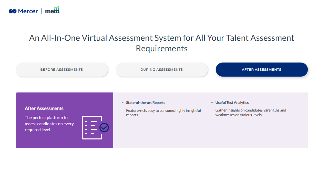 Mercer | Mettl’s research-backed assessments, efficient cloud platform, and in-depth analytics help them deliver transformative results for their clients and employees. The company offers solutions for: