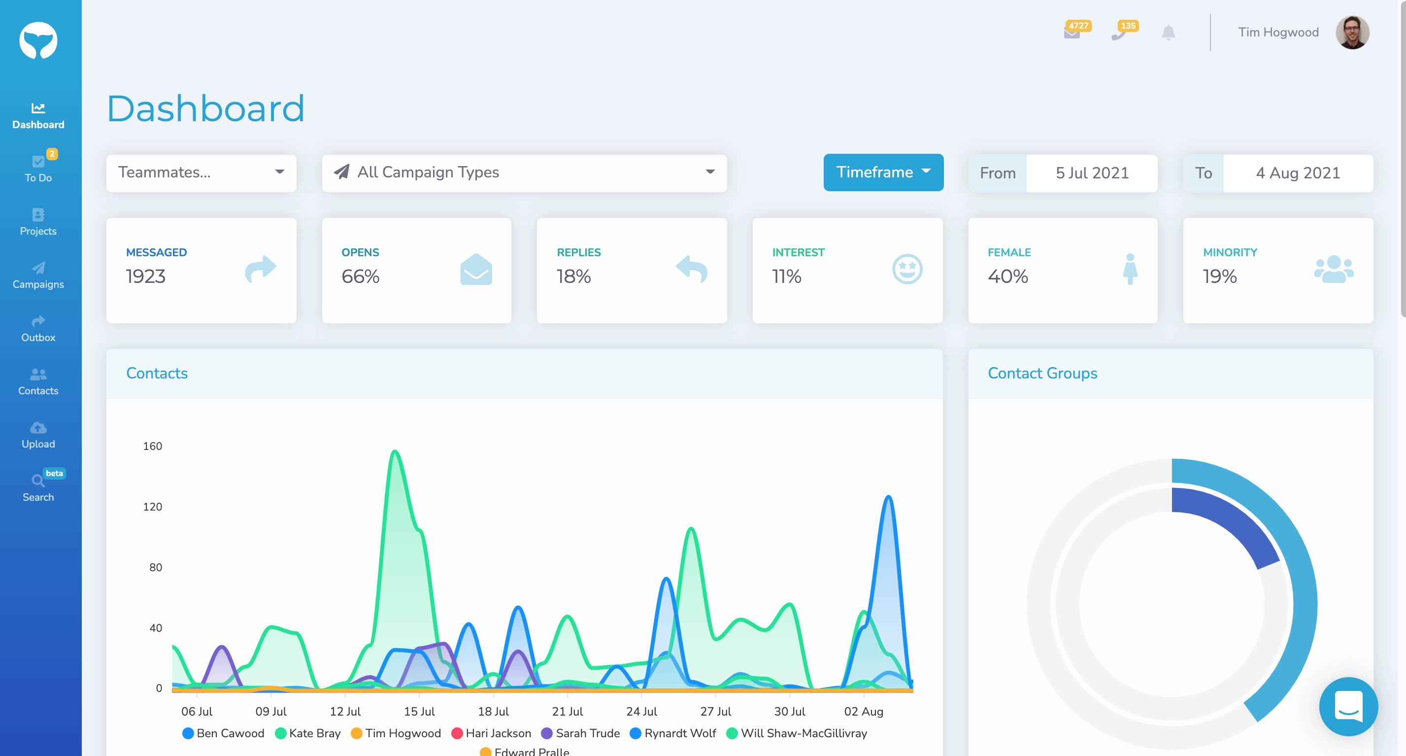 Instead of recruiters running 4 different chrome extensions to find candidate contact details, they can run SourceWhale, find accurate contact details, automatically add the prospect/ candidate to a hyper-personalised message sequences that go directly from their Outlook/Gmail from wherever they are on the web, including following up with individuals if you haven’t heard back from them. Additionally SourceWhale provides analytics around messaging to show whats working and whats not, diversity analytics and more.