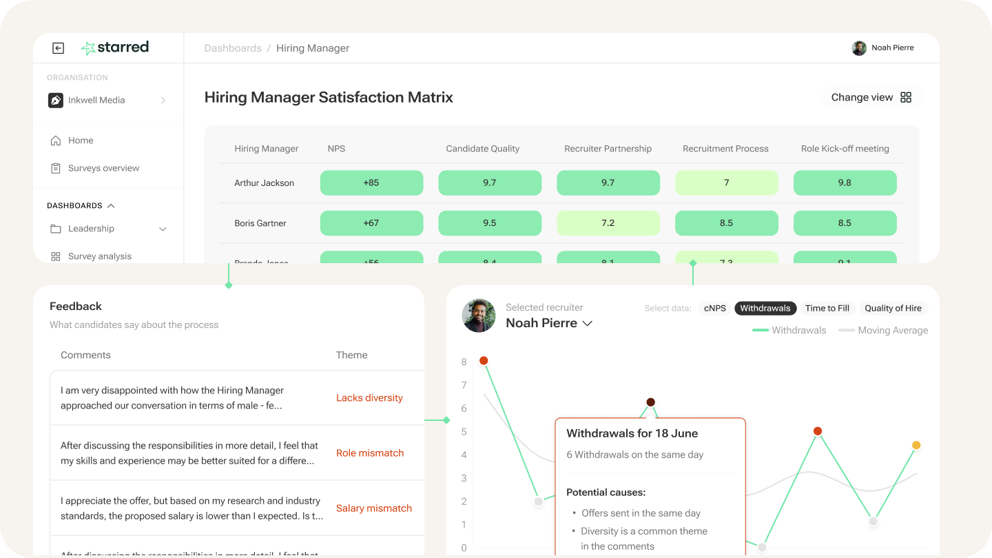 Starred’s intelligent dashboards let you analyze feedback by recruiter, department, job, location and much more, so you can focus on what matters most. Join Starred’s global community of data-driven companies to benchmark performance, unlock insights with Comment Analysis, and build action plans with the Priority Matrix.