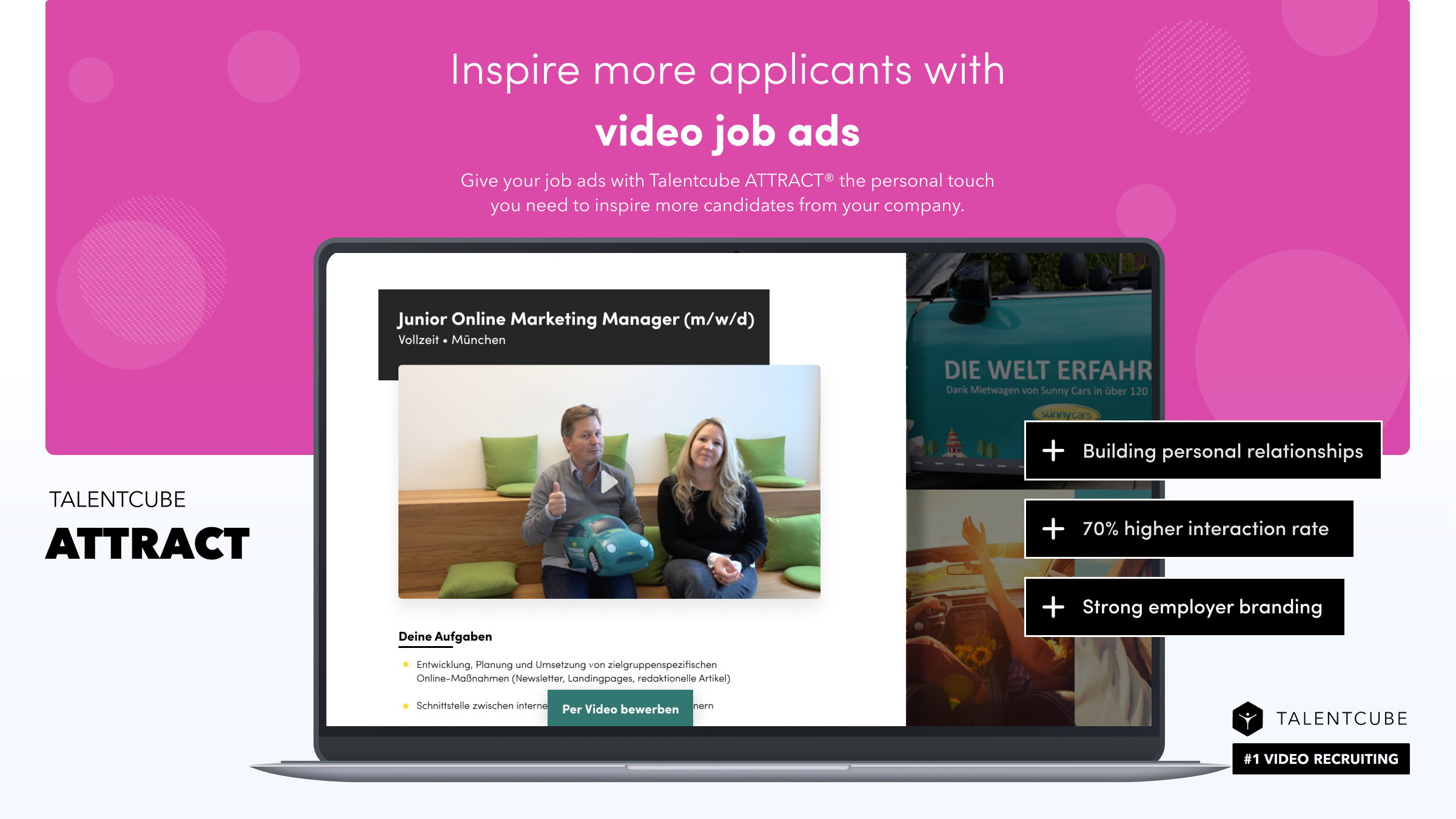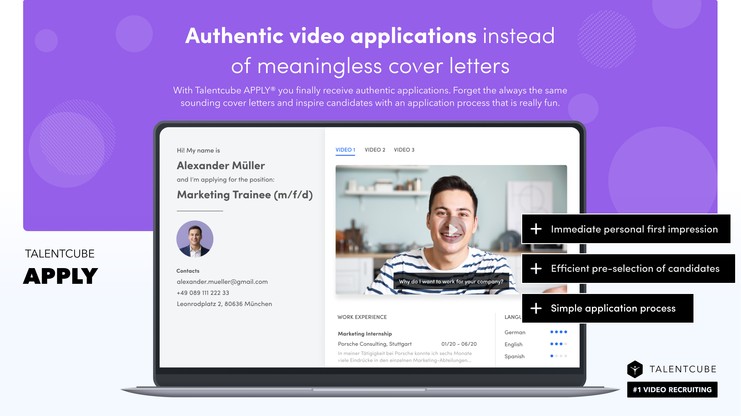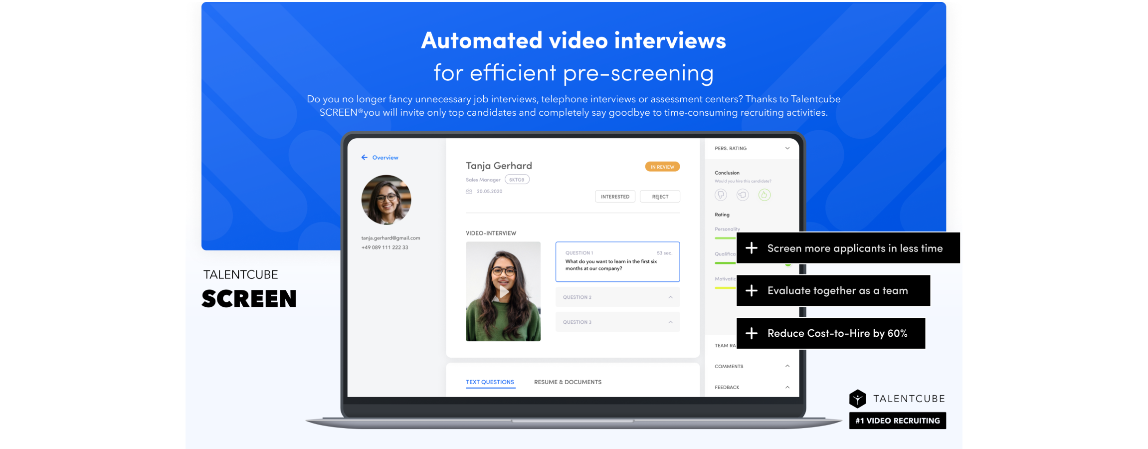 Talentcube is your global partner for video recruiting. Get an authentic impression of each applicant from the very beginning and identify your top candidates directly thanks to our award-winning video technology. Over 200 companies in Europe and America already trust in the best candidate experience on the market. Reduce the number of time-consuming job interviews and save up to 60% of your recruiting costs. Why Talentcube?