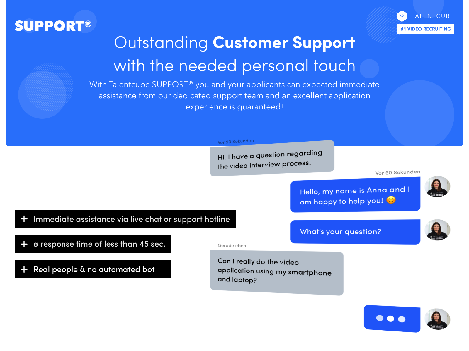 • Personal support team provides answers to you and your candidates in under 90 seconds.